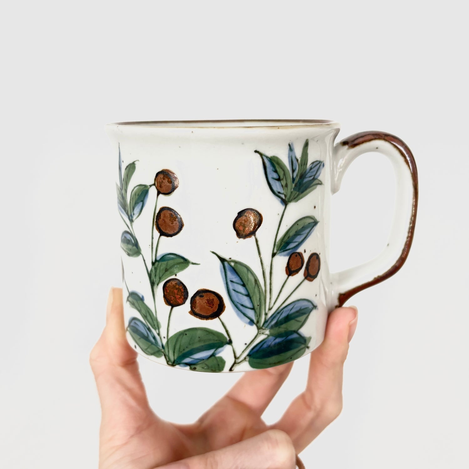 This is a vintage Otagiri speckled stoneware mug, likely from the 1970s, featuring a hand-painted botanical or floral pattern.