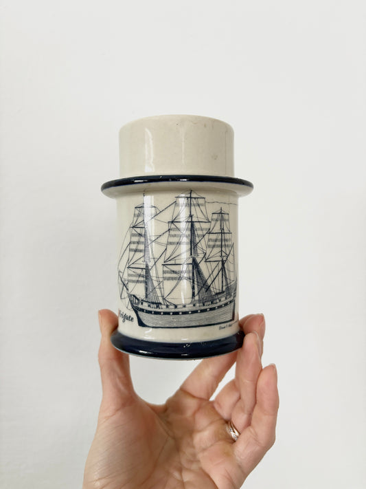 Vintage CCCC Japan Ceramic Candle Holder with Frigate Ship Illustration by Bruce E. Hart