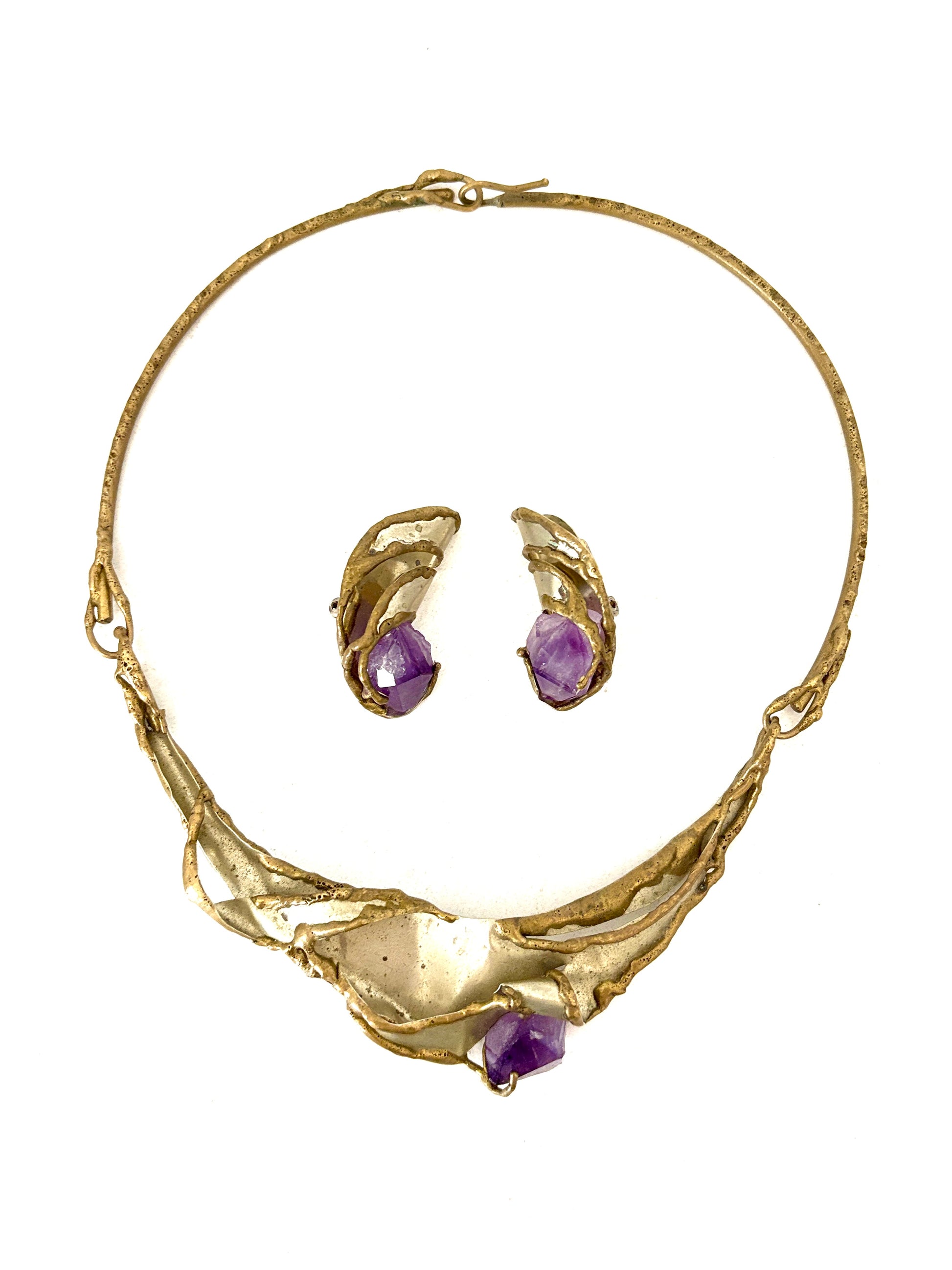 Make a bold statement with this striking 1960s Brutalist necklace, a rare and captivating piece of wearable art. Crafted from mixed metals, primarily aged brass, this avant-garde design showcases a raw, sculptural aesthetic emblematic of the Brutalist movement. At its heart, clusters of natural amethyst crystals add a dramatic pop of deep violet—each stone uniquely formed, echoing the organic, freeform essence of the era.