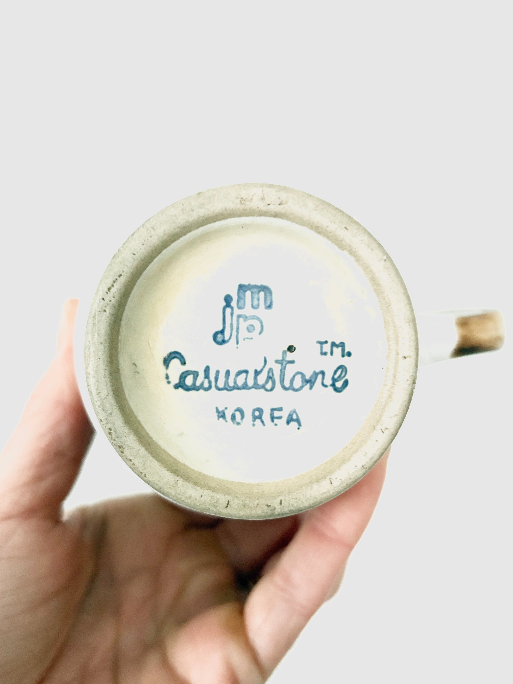 A genuine vintage piece from the 1980s, this JMP Casualstone coffee mug embodies the warmth and understated charm of classic stoneware. Its earthy palette of brown, blue, and tan glazes reflects the era’s appreciation for natural tones and handcrafted texture, making each mug subtly unique.